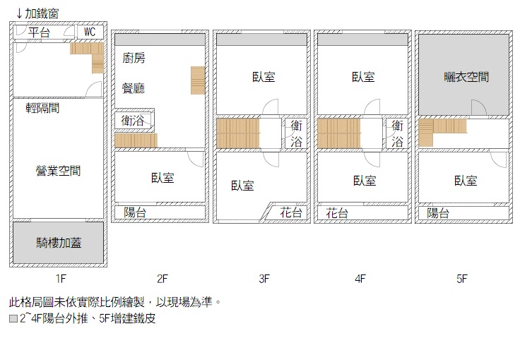 2.陽台外推、騎樓加蓋、一樓平台加鐵窗、五樓加蓋鐵皮。