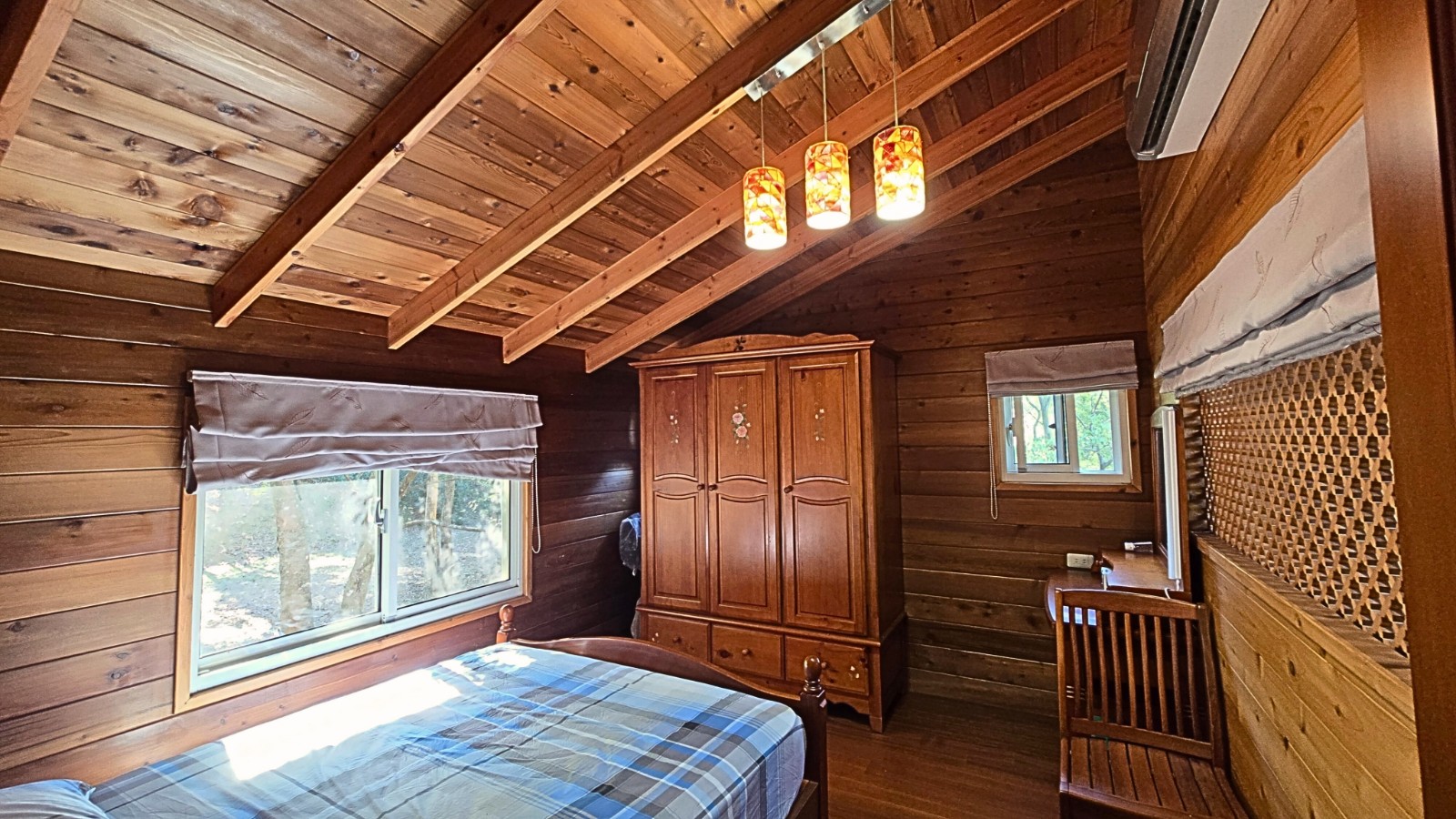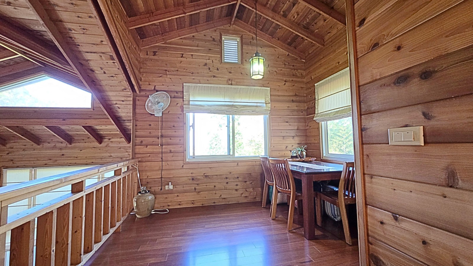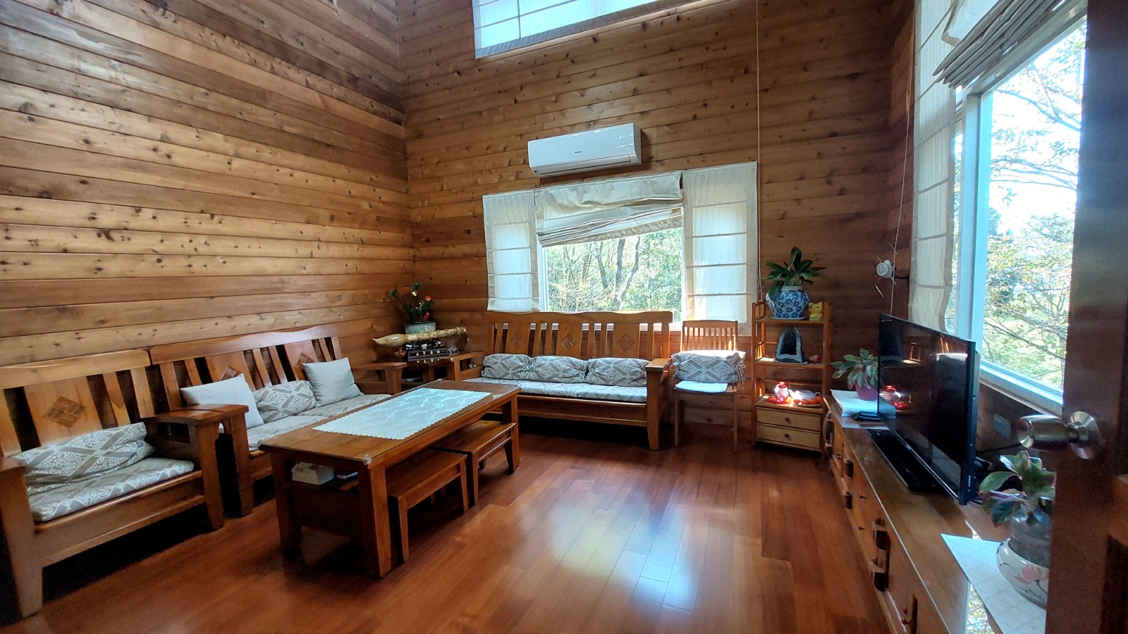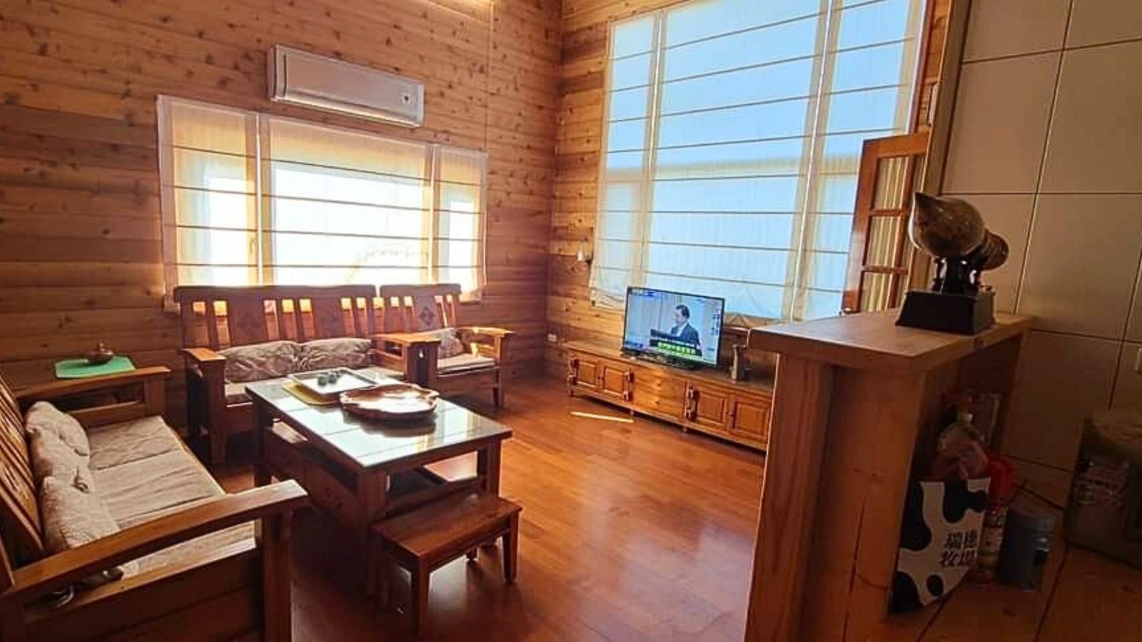 4.木屋屋齡約15年、使用山泉水、桶裝瓦斯、可申請網路。步入室內,濃鬱而溫潤的木頭香氣撲鼻而來。高挑的客廳空間感十足,搭配溫馨的木質傢俱與大片採光窗,陽光灑落在實木地板上,整體氛圍靜謐而療癒,讓人不自覺放慢腳步、放鬆身心