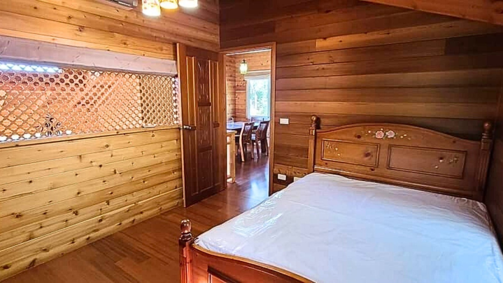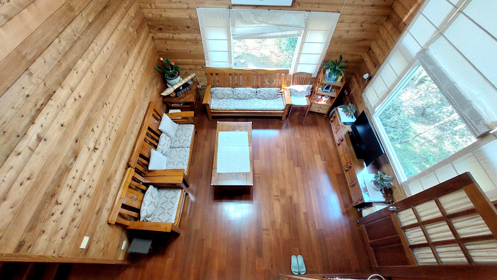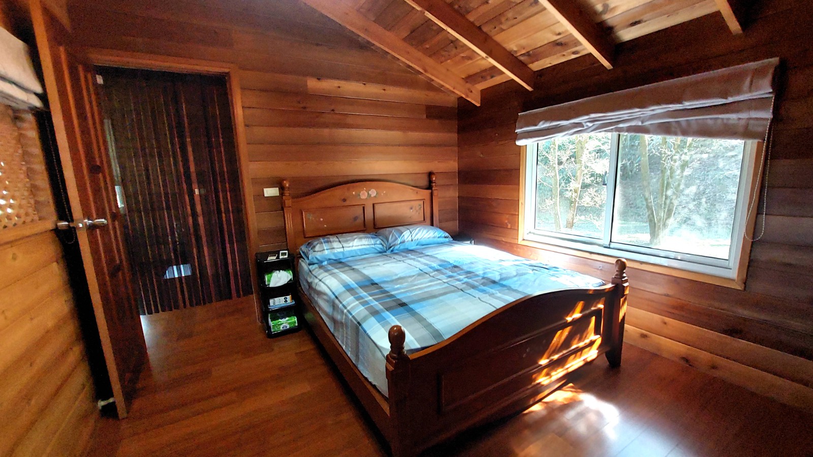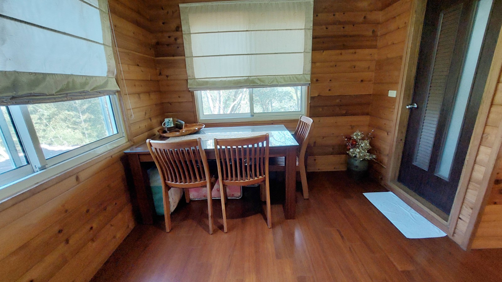 4.木屋屋齡約15年、使用山泉水、桶裝瓦斯、可申請網路。步入室內,濃鬱而溫潤的木頭香氣撲鼻而來。高挑的客廳空間感十足,搭配溫馨的木質傢俱與大片採光窗,陽光灑落在實木地板上,整體氛圍靜謐而療癒,讓人不自覺放慢腳步、放鬆身心