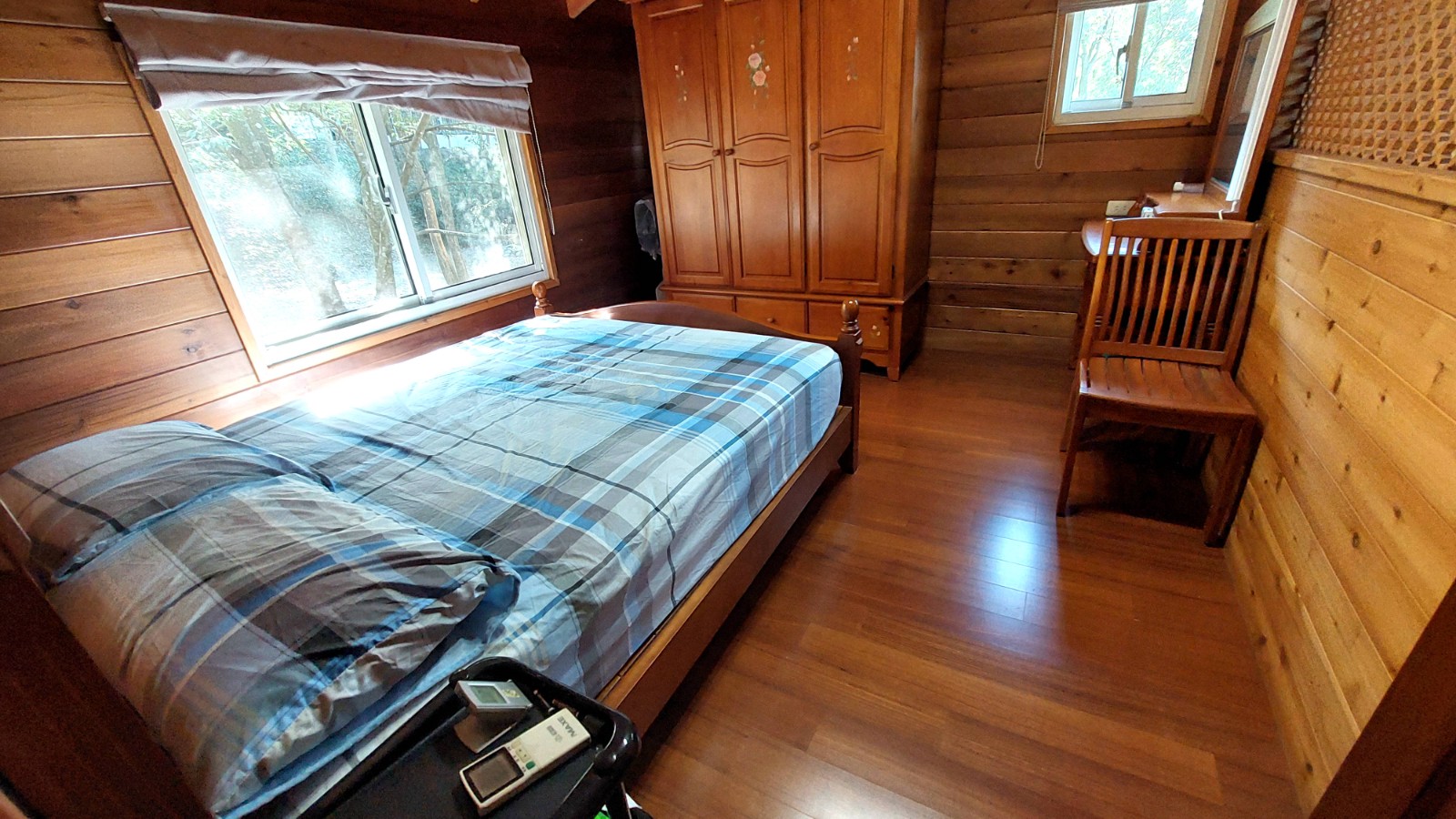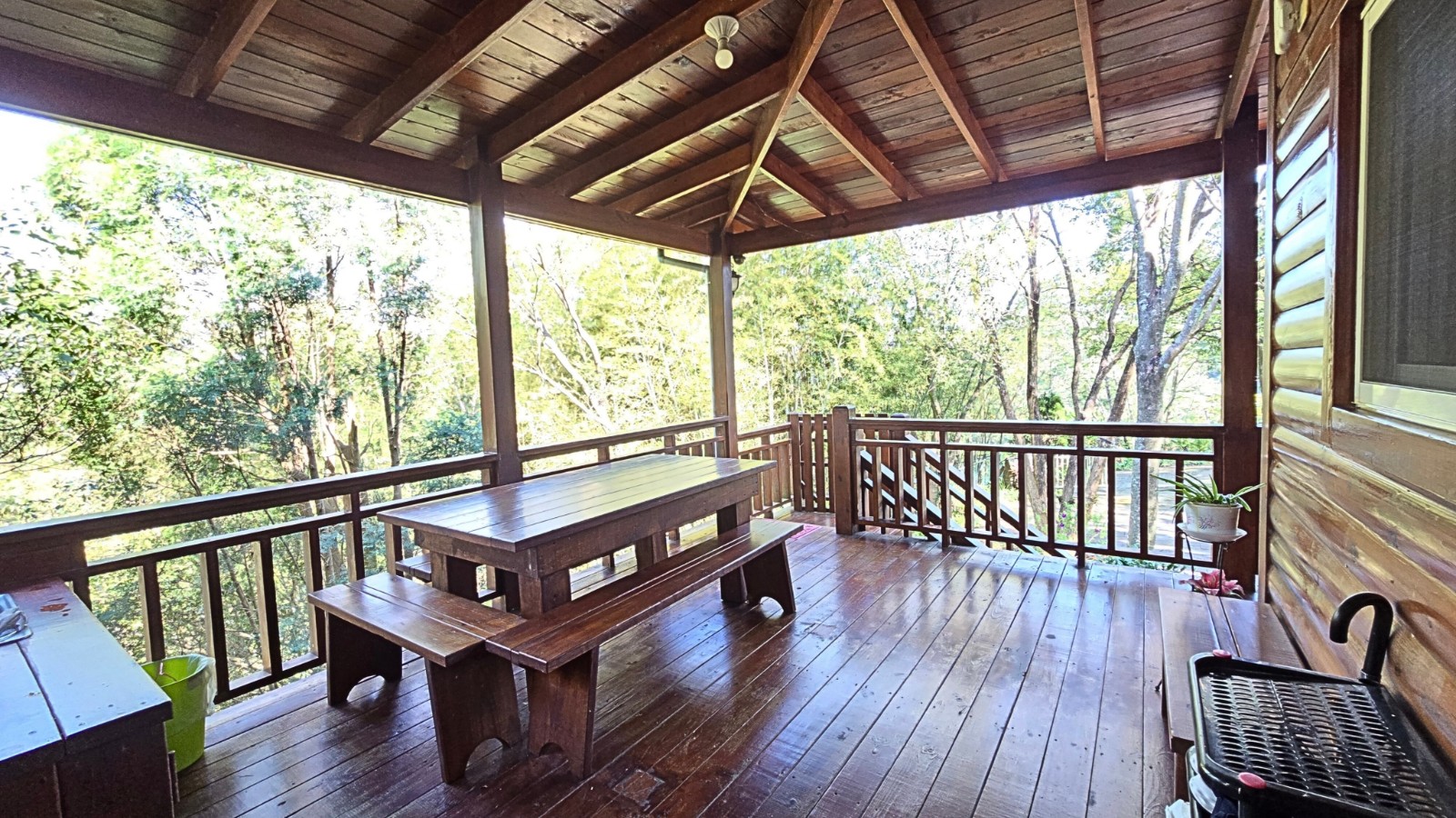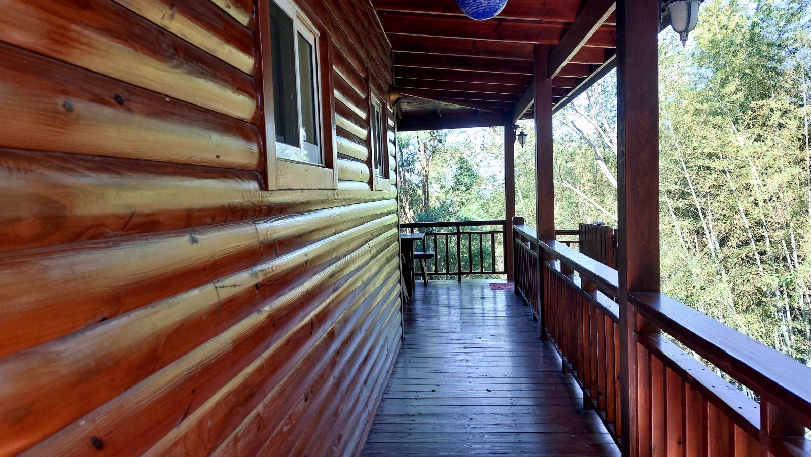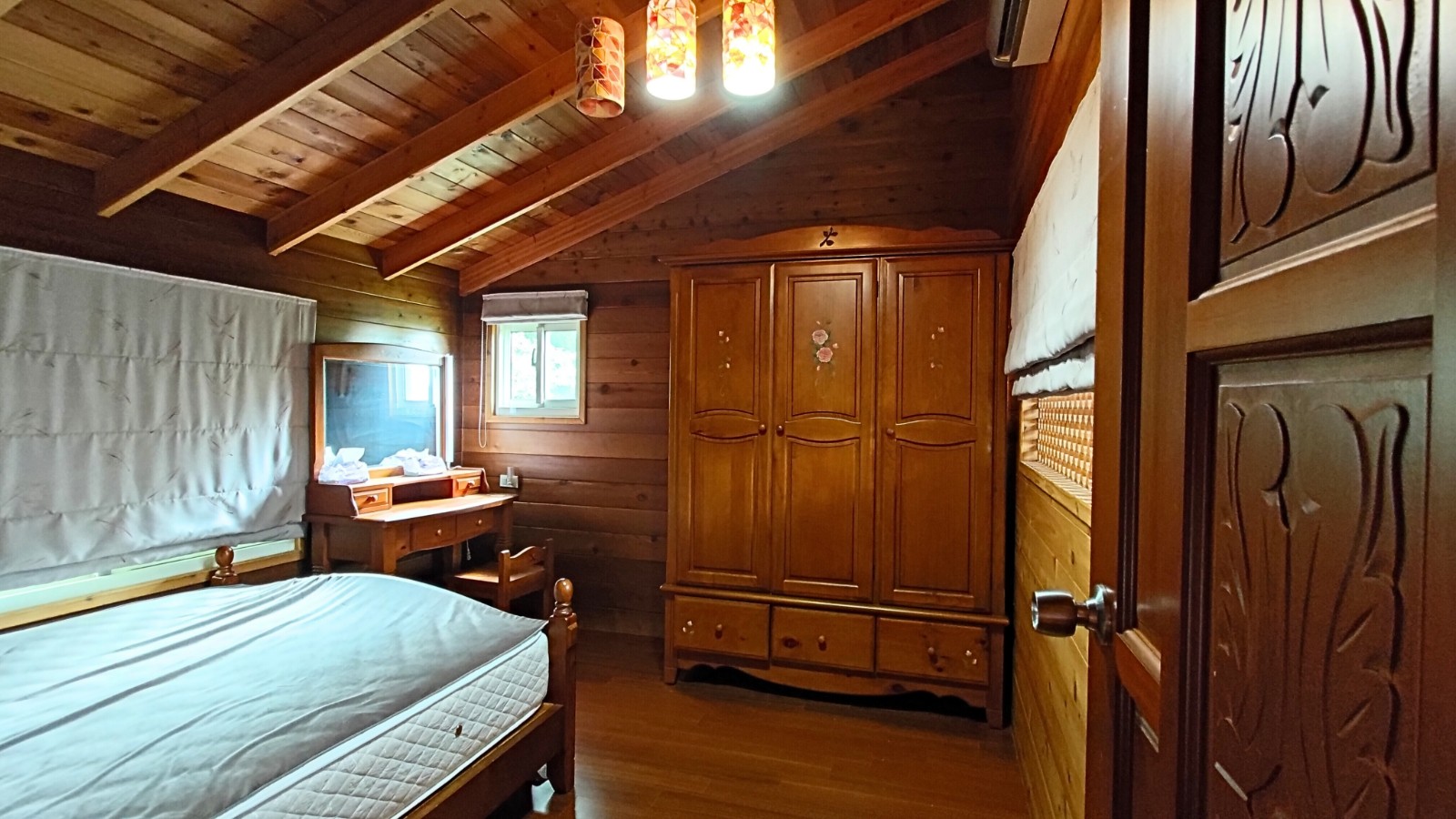 4.木屋屋齡約15年、使用山泉水、桶裝瓦斯、可申請網路。步入室內,濃鬱而溫潤的木頭香氣撲鼻而來。高挑的客廳空間感十足,搭配溫馨的木質傢俱與大片採光窗,陽光灑落在實木地板上,整體氛圍靜謐而療癒,讓人不自覺放慢腳步、放鬆身心