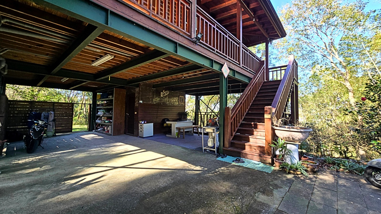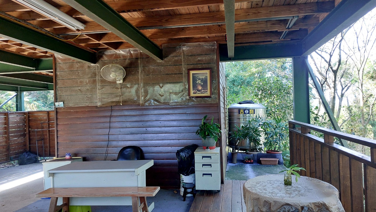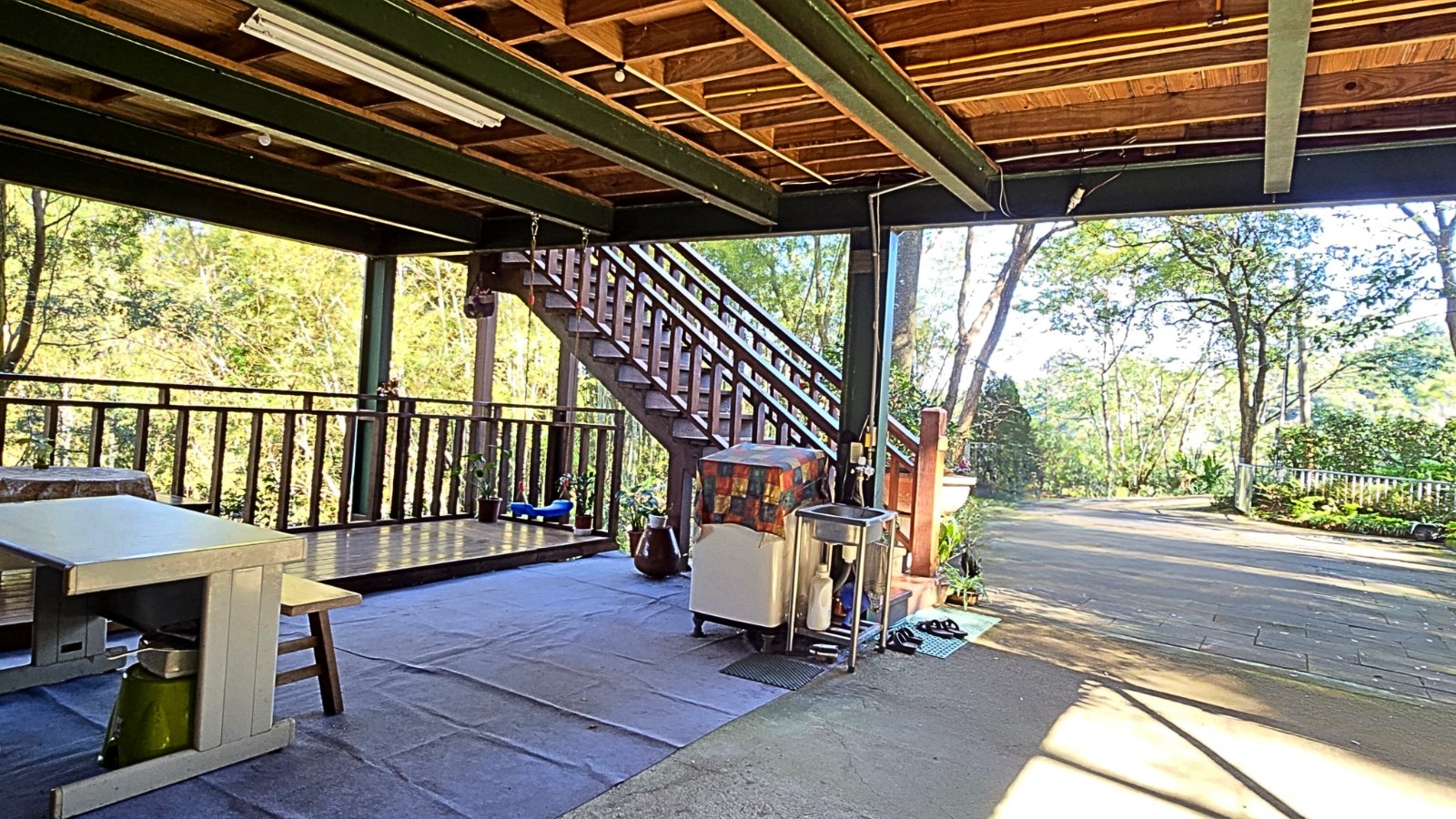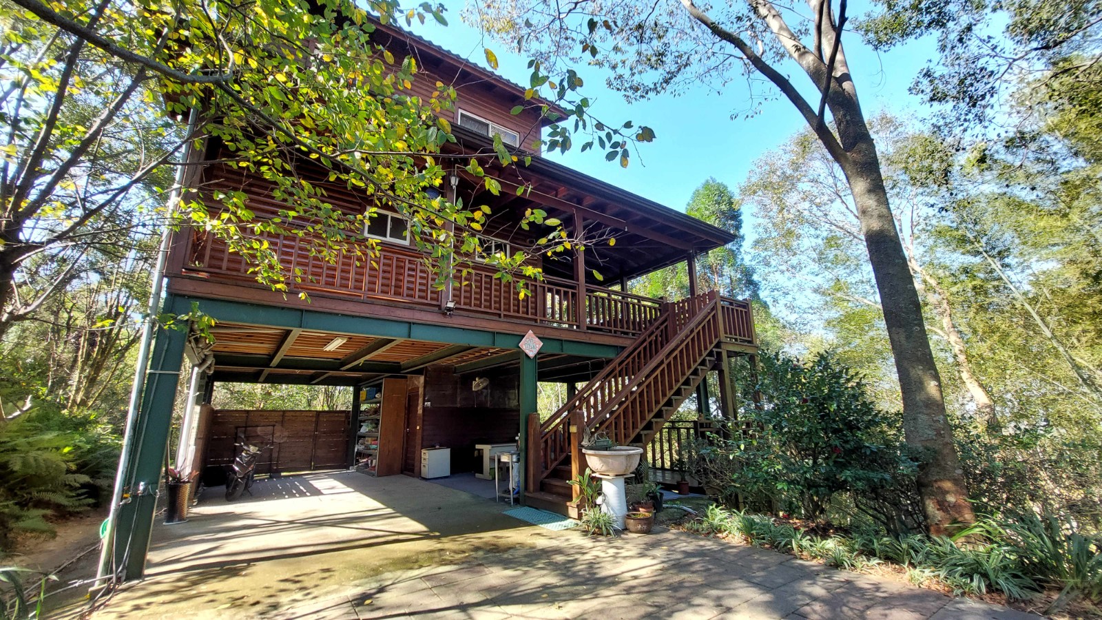 3.現況為一間鋼構木屋,採挑高設計,一樓平面作為停車區域、另設有一間獨立儲藏室,用於放置水塔、瓦斯桶及各式農用資材,收納機能完善。拾階而上,二樓為大坪數木造露台,空間寬敞開闊,無論午後品茗、賞景小憩,皆是難得的愜意享受