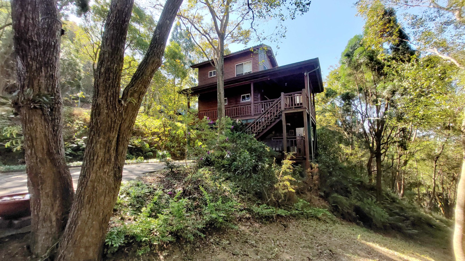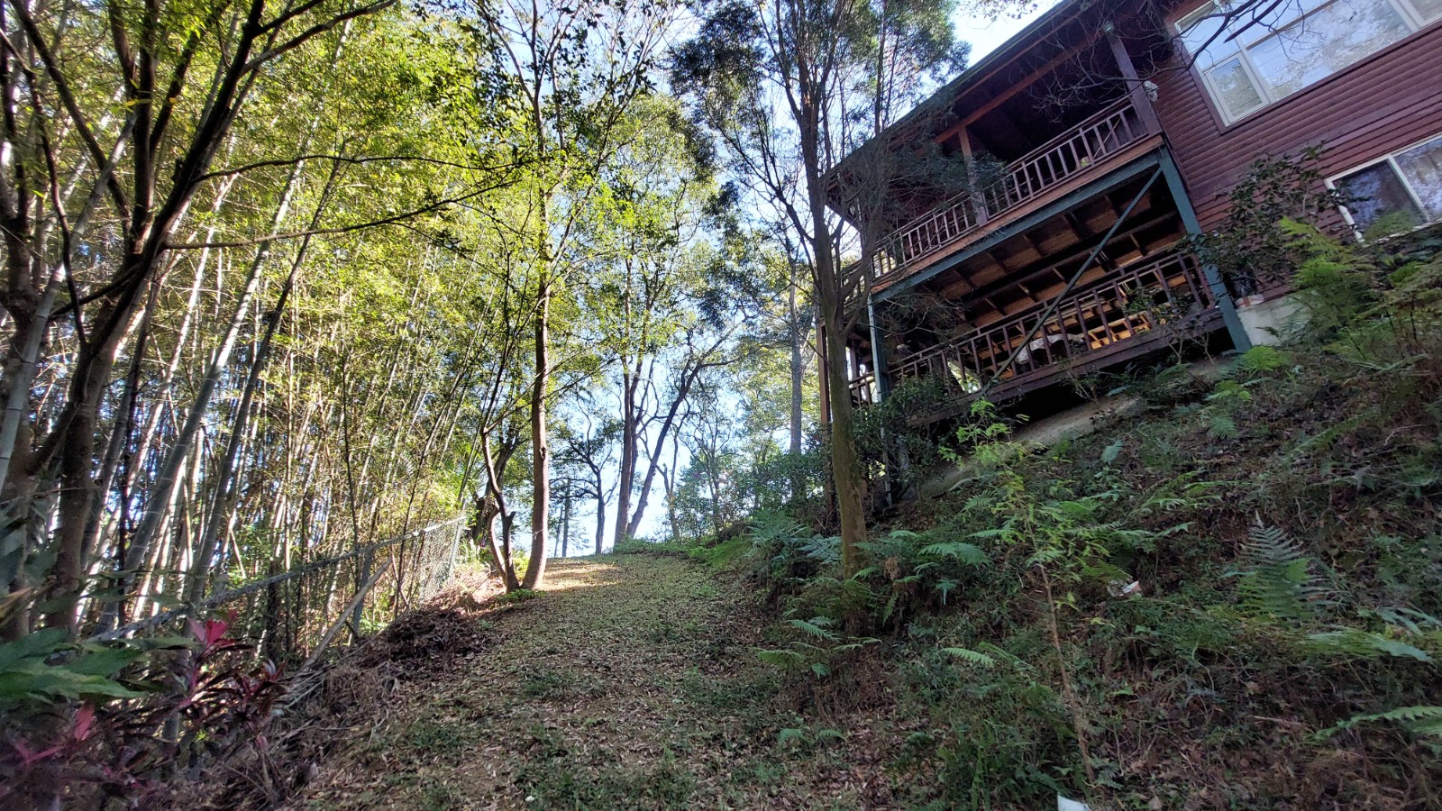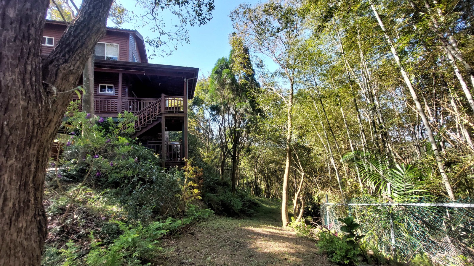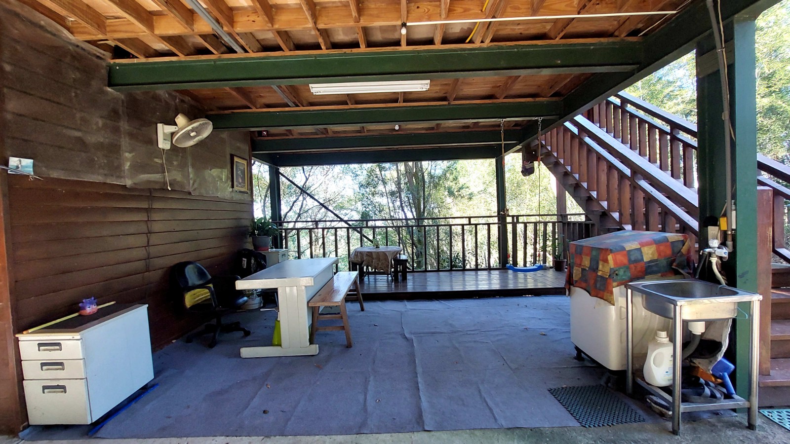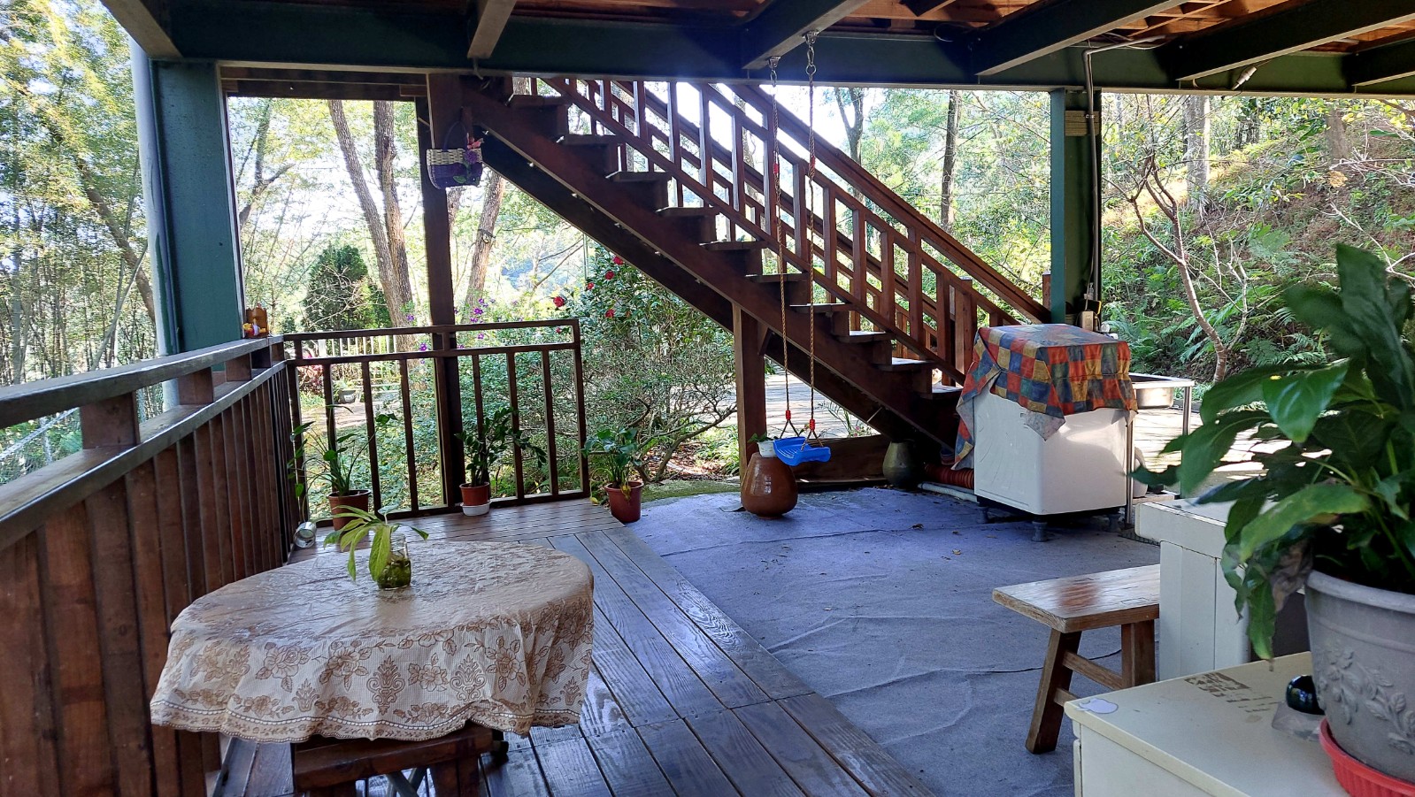 3.現況為一間鋼構木屋,採挑高設計,一樓平面作為停車區域、另設有一間獨立儲藏室,用於放置水塔、瓦斯桶及各式農用資材,收納機能完善。拾階而上,二樓為大坪數木造露台,空間寬敞開闊,無論午後品茗、賞景小憩,皆是難得的愜意享受