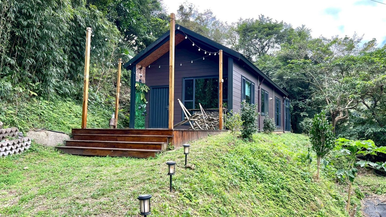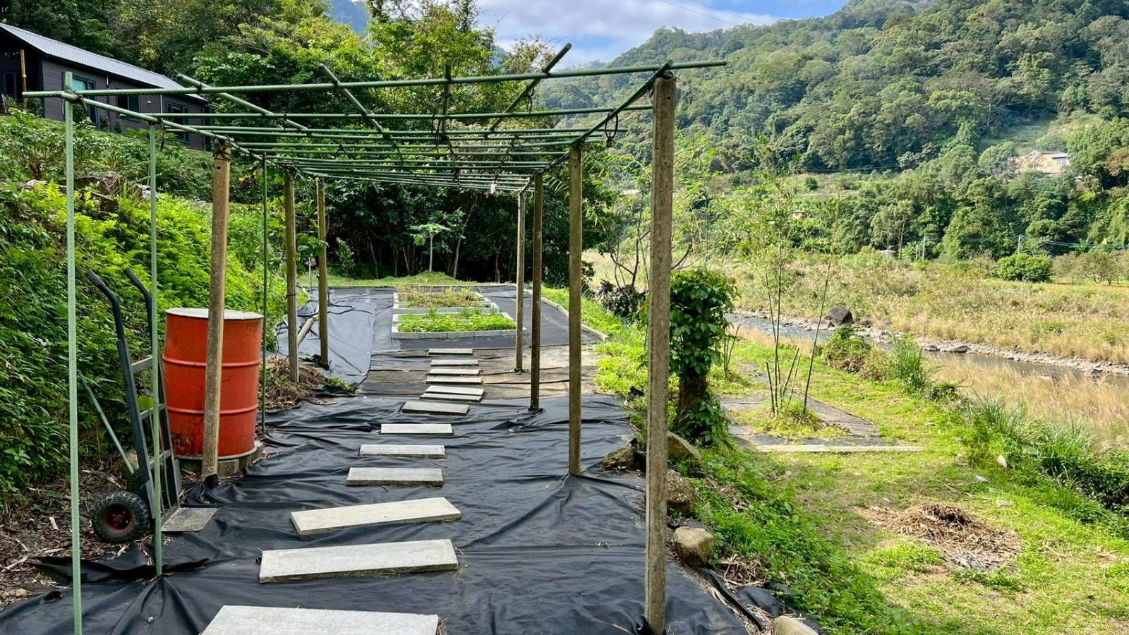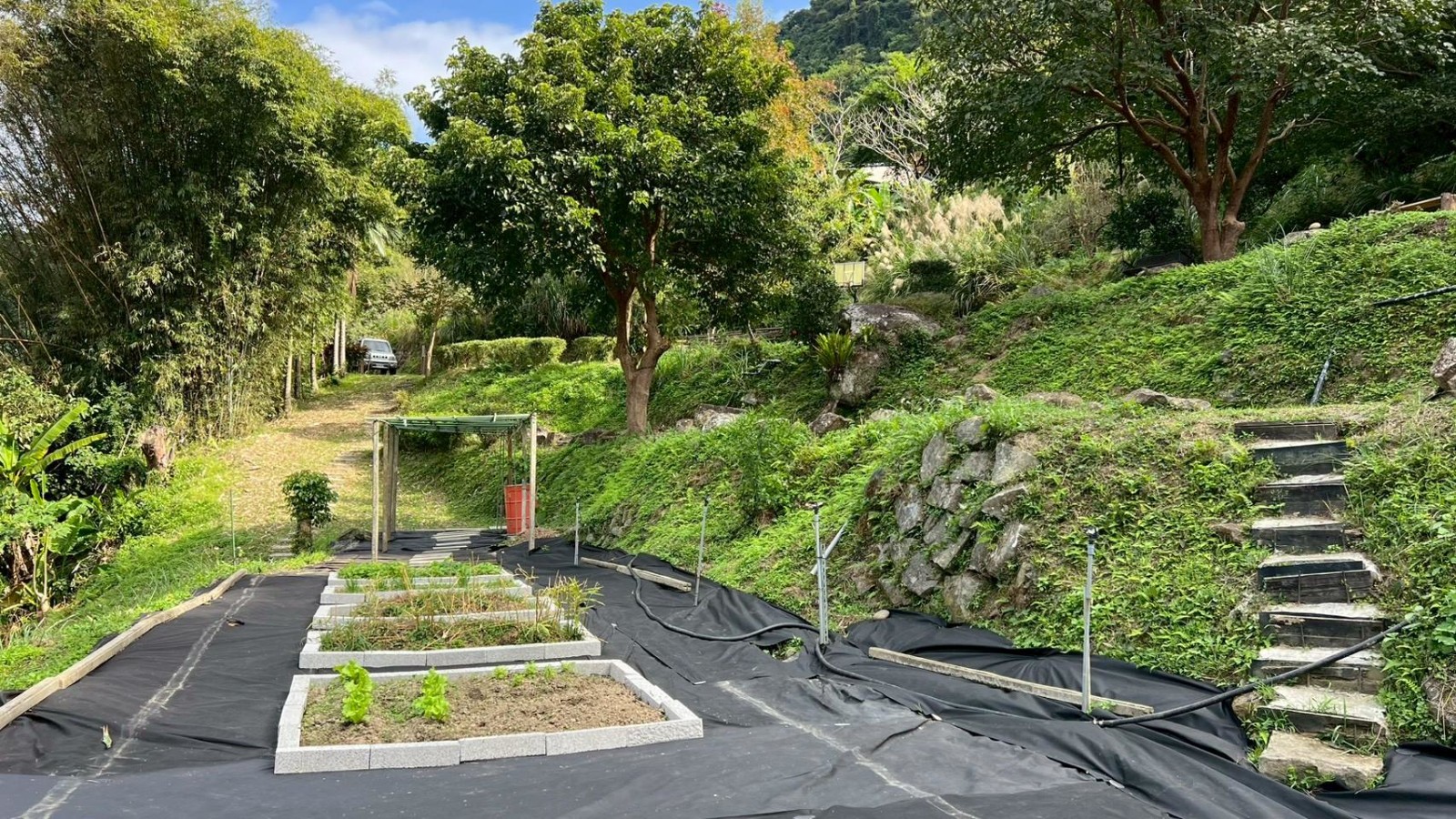 3.房屋左上方另有一座小型平台,可作休閒或景觀用途。土地依地形分為數個階層:第二階:設有生態池,池邊環境自然,常見蜻蜓、蝴蝶停棲,生態豐富。第三階:規劃為菜園區與工具間,方便日常種植管理、收納農具。第四階:種植綠竹筍與田龍筍,可季節採收,享受自種食材的樂趣。