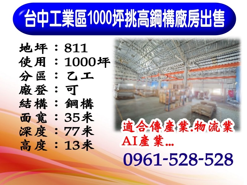 台中工業區|860坪|大面寬|三照廠房出售