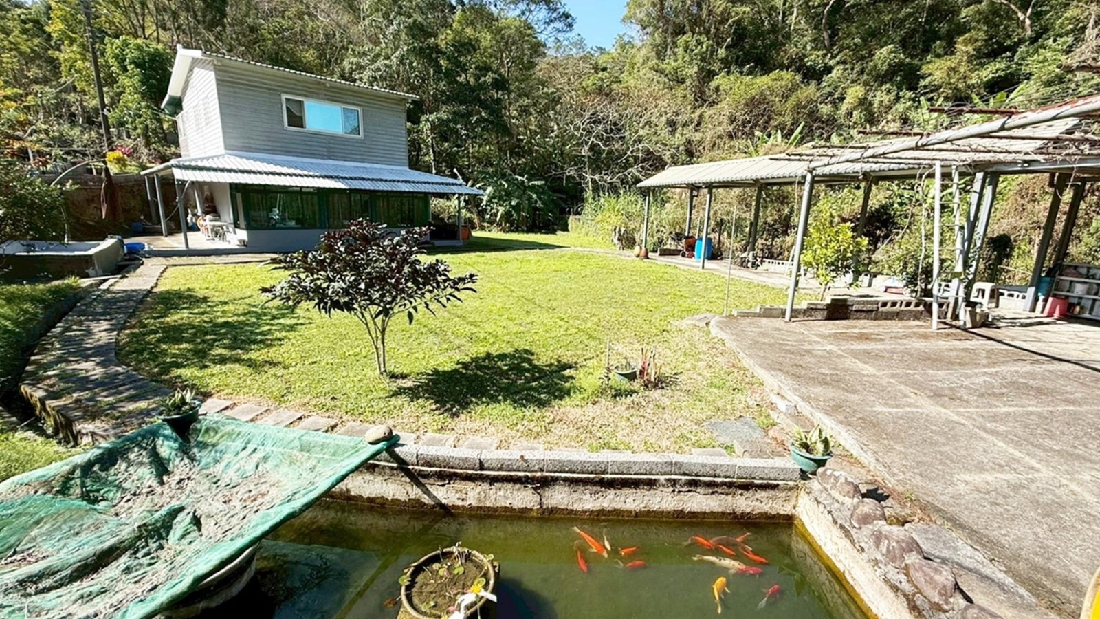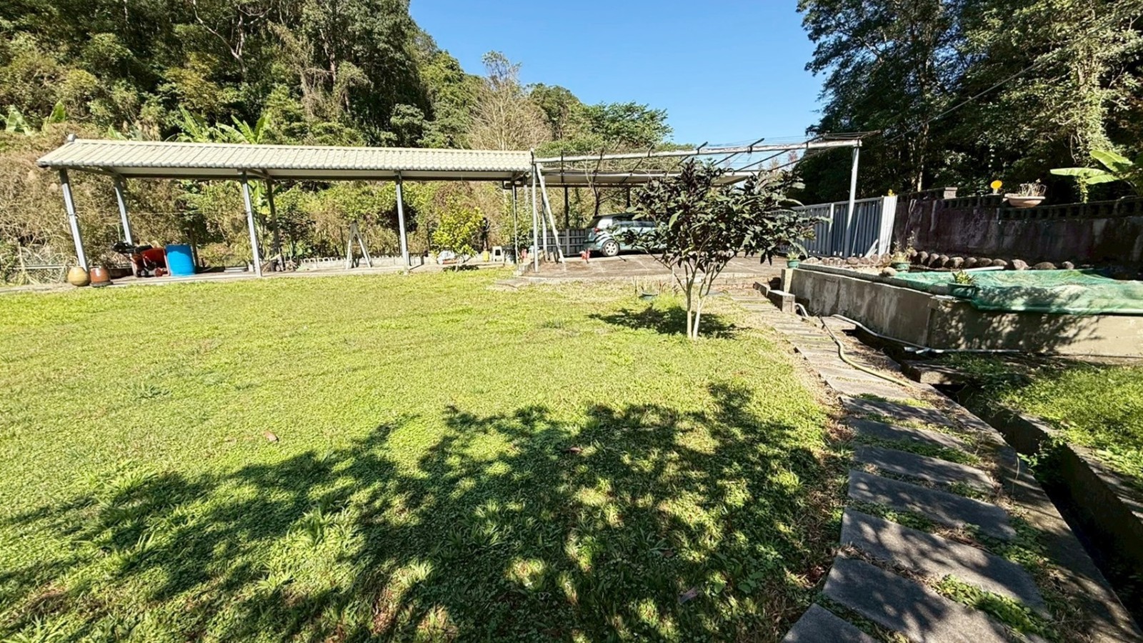 4.附屬設施豐富,園內鋪滿草皮,設有戲水池、景觀魚池、停車棚(私有庭院車位)、果園區,果園區種有黃金果、砂糖橘、金桔、樹葡萄、酪梨、柚子、芭樂、香蕉……等,享有現成的休閒娛樂設施。