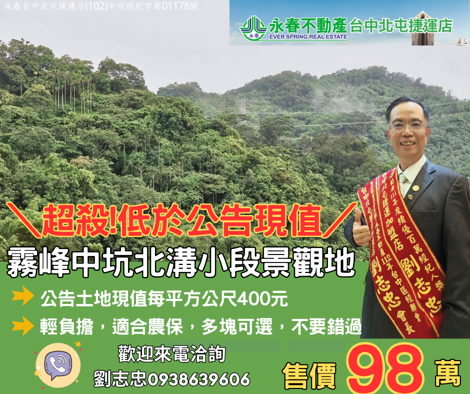 低於公告土地現值霧峰中坑北溝小段農保地景觀地82台中買屋賣房