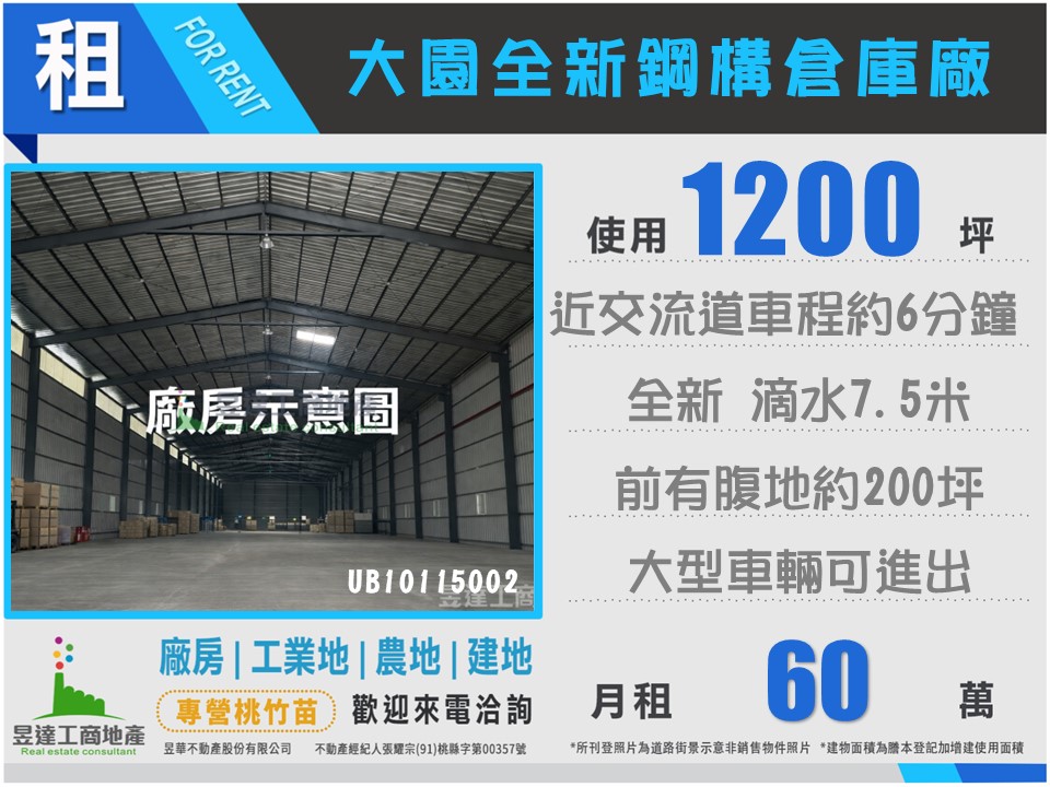 大園大腹地全新挑高鋼構廠房/工業地廠房買賣租賃